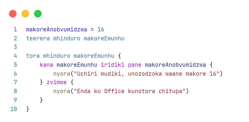 Takambokupa basa rekuudza vanhu vauya kuzotora zvitupa kuti vaende ku Office kunotora chitupa kana vaine makore 16 zvienda mberi, kana kuti vaende kumba kana vaine makore 15 zvichidzika mutopic ye enzaniso. Patanyora code yezvitupa, takagadzira variable inonzi makoreEmunhu tikabva taipa makore acho iri nhamba. Kana wakanganwa, tarisa pazasi apa code yacho yese yatakanyora
