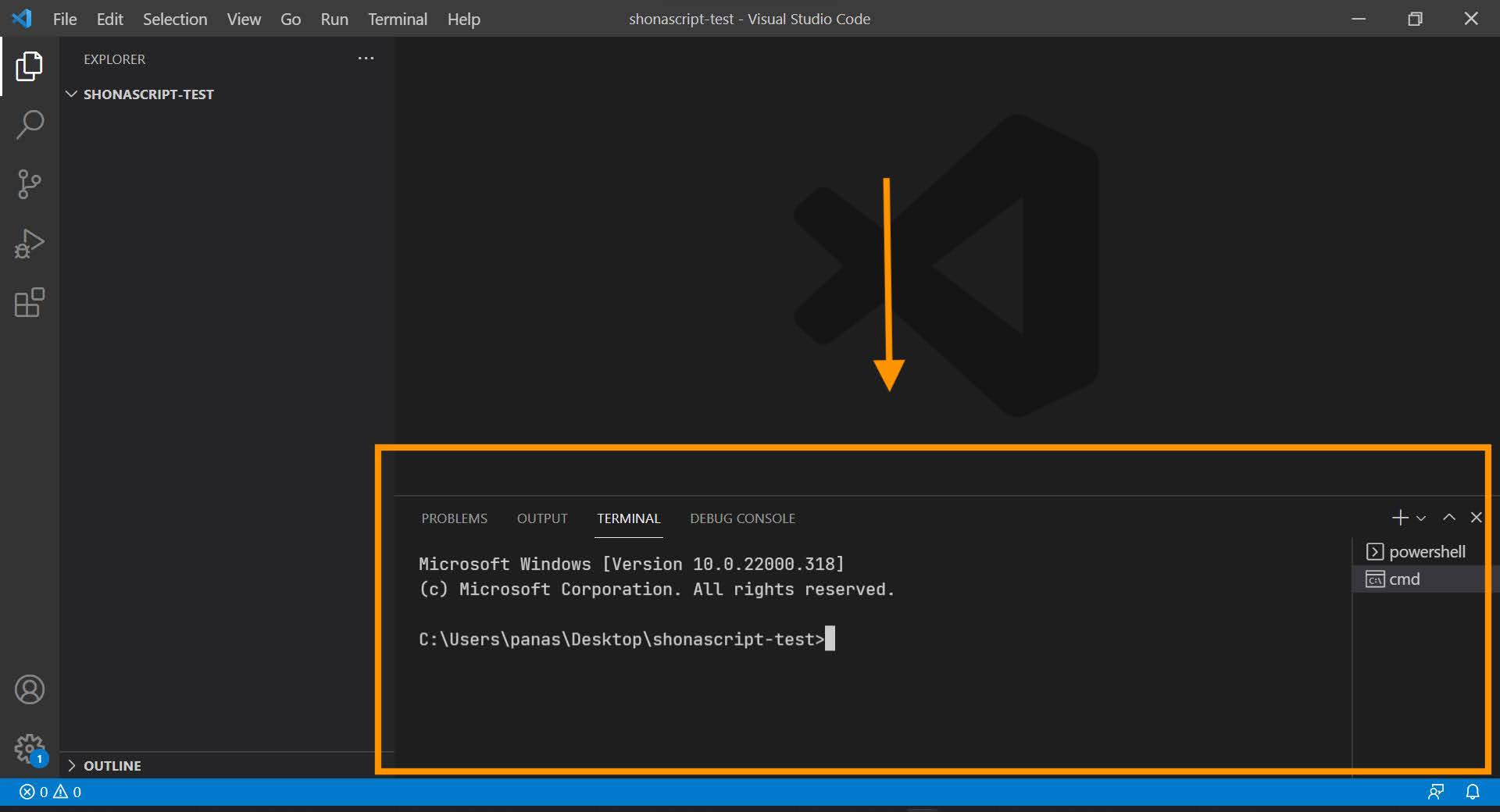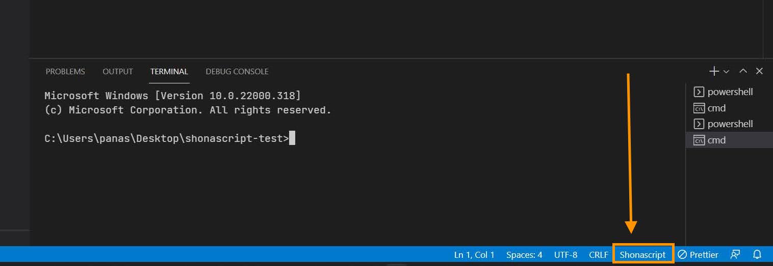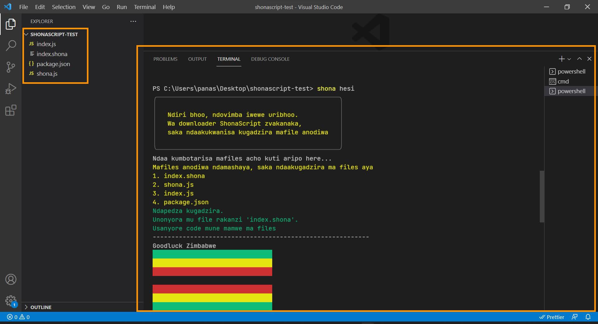 folderrako rawagadzira riya muVS Code, unofana kuona kutiShonaScriptyagadzira mafiles 4:index.shona- ndomauchanyoracodeindex.js- usanyore chinhu umushona.js- usanyore chinhu umupackage.json- usanyore chinhu umu